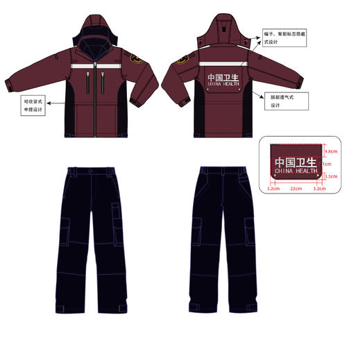 款式参照《国家卫生应急队伍标识》关于服装之要求,该样服的色调搭配和布料材质应符合《中国卫生应急服装技术规范(试行)》。